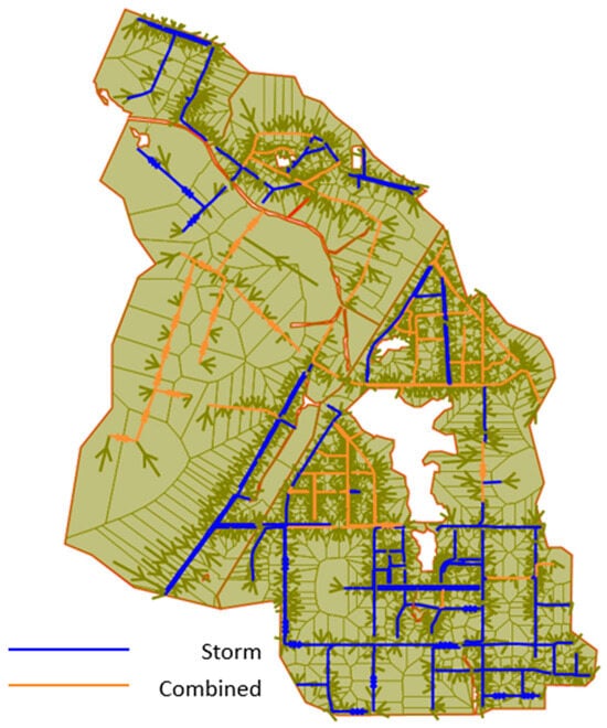 In accordance with the Chinese Standard for the design of outdoor wastewater engineering (GB50014-2021) [22], traditional rational formulas are used for designing stormwater pipes. For a 1-year return period, no pressurized flow should occur; in comparison, for a 3-year return period, pressurized flow may occur but without surface overflow. Therefore, we used the occurrence of pressurized flow as the criterion for assessing the performance of the sewer network.