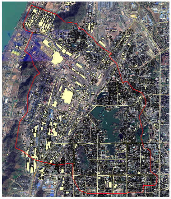 After establishing the runoff generation model, the underlying surface conditions of the study area are assessed using current land use data and satellite remote sensing imagery. By vectorizing the locations of buildings and roads and importing these data into the InfoWorks ICM model, more accurate land use information can be extracted for the region (see Figure 6). This process enhances the precision of the runoff generation and concentration model, allowing for a more effective simulation of hydrological responses within the Yushan Lake drainage area. The improved data quality facilitates better predictions of runoff behavior, which is essential for effective stormwater management and flood control strategies.