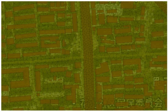 To optimize computational speed and accuracy, the meshing of the model can be adjusted based on practical requirements. For tall buildings that are unlikely to be inundated by floodwaters, these structures were designated as blank areas. During the meshing process, these buildings were excluded to prevent the creation of internal flooding and stagnant water. For road areas, which frequently function as drainage channels, roads were divided into gridded intervals. These intervals were further separated into individual grids, with elevation corrections applied as required. Ultimately, the study area was divided into a total of 428,860 grids, with a minimum cell area of 25 m2 and a maximum cell area of 100 m2. This grid configuration enhances the model’s ability to accurately simulate hydrological responses and drainage dynamics within the Yushan Lake area (see Figure 7).