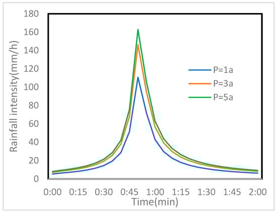 At present, several traditionally designed rainfall patterns are widely recognized and utilized, including the Chicago Rainfall Pattern, Huff Rainfall Pattern, Pilgrim and Cordery Rainfall Pattern, Triangular Rainfall Pattern, SCS Rainfall Pattern, and Frequency Analysis Rainfall Pattern [23,24,25,26,27]. Among them, the Chicago Rainfall Pattern is favored by many cities in China due to its simplicity in calculations and low reliance on storm data. The Chicago Rainfall Pattern is a short-duration design rain pattern for the design of urban stormwater facilities, proposed by Keifer and Chu in 1957. It is mainly used to simulate high-intensity rainfall processes in a short period of time to evaluate and design the capacity of drainage systems. This rain pattern is derived from the Intensity–Duration–Frequency relationship (IDF). According to the Chinese Standard for design of outdoor wastewater engineering (GB50014-2021) [22], the rainfall duration determined by the short-duration rainstorm rain pattern is 30 min, 60 min, 90 min, 120 min, 150 min, and 180 min, a total of six durations. In this study, the 120 min rainfall duration was selected for model construction in larger urban areas with reference to the rainfall duration used in similar studies [28].