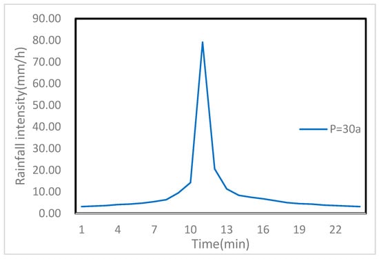 According to the “Anhui Province Hydrology Manual”, compiled by the Anhui Provincial Water Conservancy and Hydropower Survey and Design Institute, the key parameters for calculating the 24 h storm include the coefficient of variation (Cv) and the skewness coefficient (Cs). Based on the data in the regional results table, the values are given as Cv = 0.55 and Cs = 4 × Cv. Using the Pearson Type III distribution, the modulus ratio Kp for a 30-year return period (with a 2.32% probability) was determined to be 2.32. This results in a maximum 24 h design point rainfall value of 232 mm. According to the data in the point-to-area conversion coefficient table for the Jiangnan region, the conversion coefficient for the Ma’anshan area is 0.975, yielding a 30-year, 24 h design area rainfall value of 226 mm. To categorize the rainfall distribution over 24 h, the comprehensive results table of hourly rainfall distribution for the Jiangnan region, calculated from actual rainfall data statistics, was used. From this, the rate of rainfall for each hour was determined, as shown in Table 2. These data were used to create the 30-year, 24 h rainfall hyetograph, as illustrated in Figure 9. This hyetograph provides a detailed breakdown of the rainfall distribution over time, essential for accurate drainage system simulations.