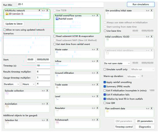 InfoWorks ICM is an integrated catchment modeling software program developed by Wallingford Software for the simulation and management of water resource systems such as urban drainage systems, natural river systems, and wastewater treatment plants. This software helps users integrate and simulate different types of water systems, such as stormwater, sewage, and rivers, by providing a comprehensive solution. InfoWorks ICM provides highly accurate and scalable model modeling capabilities to more accurately simulate and predict hydrological processes. Users can build 2D models to represent subsurface networks, surface water networks, and surface physical features and utilize their analysis tools for simulation and optimization. The software also features a simplified modeling process, integrated water resource simulation, and support for multiple types of simulations, such as flow simulation, water quality simulation, and sediment simulation. This software is primarily used for simulating, analyzing, and optimizing the design of urban drainage systems, offering a fully integrated approach to urban water environment modeling and supporting the import and export of various data formats, including GIS data, Computer-Aided Design (CAD) files, Excel spreadsheets, Access, Structured Query Language (SQL), and Oracle databases. Due to its versatility, it is widely employed in urban waterlogging risk assessments, drainage system upgrades, urban planning, and related research projects [17,18,19,20,21].