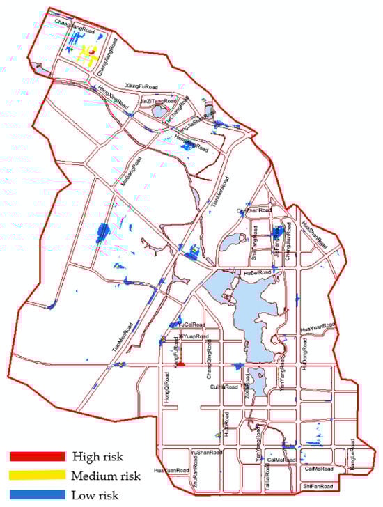 Using a 30-year, 24 h long duration rainfall event for our assessment, a flood risk map of the Yushanhu District was created (see Figure 12). The analysis shows that the high-risk area covers approximately 3.087 hectares, accounting for 0.12% of the study area. The medium-risk area spans 8.226 hectares, or 0.33% of the study area. The low-risk area encompasses 36.398 hectares, making up 1.18% of the study area. Urban flooding is primarily concentrated at key intersections, including Hunan Road and Kangfu Road, Changjiang Road and Xingfu Road, and Hongqi North Road and Xiyuan Road.