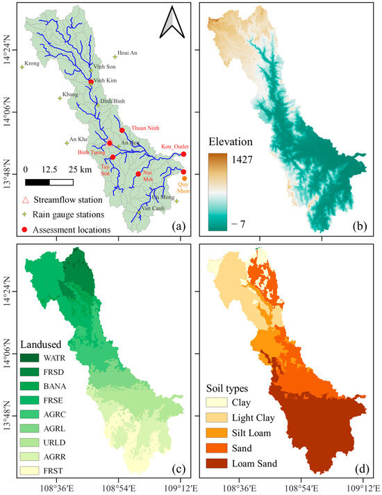 (a) Hydrological characteristics of the Kon-Ha Thanh River basin, where the locations for evaluating the effects of climate change are shown in red circles (see Section 2.6). (b) DEM (c) LULC, in which water bodies (WATR), deciduous forest (FRSD), bananas (BANA), evergreen (FRSE), agricultural land generic (AGRL), agricultural land close grown (AGRC), urban residential low development (URLD), and agricultural land row crop (AGRR). (d) Soil types.