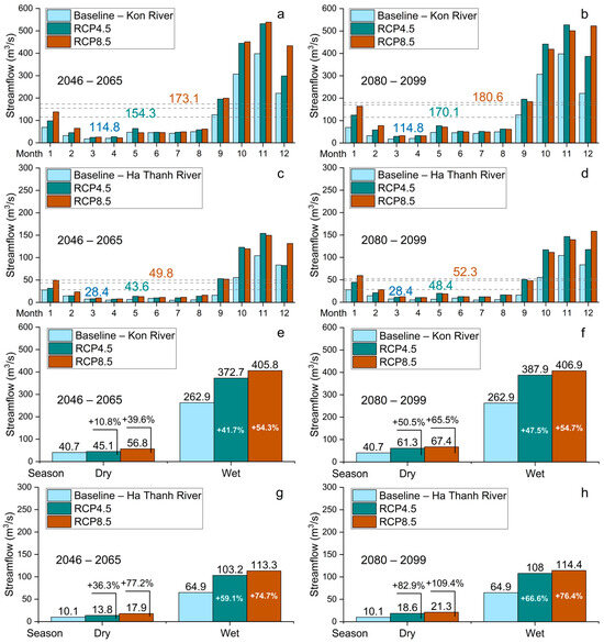 First, in Kon River, the wet season demonstrates pronounced increases in streamflow under both RCP 4.5 and 8.5 scenarios. Between 2046 and 2065, RCP 8.5 projects the highest increases during the wet season (September to December), with peak streamflow reaching 405.8 m3/s (RCP 8.5) and 372.7 m3/s (RCP 4.5), reflecting notable rises of 54.3% and 41.7%, respectively, compared to the baseline (1986–2005) (Figure 5a,b,e,f). During the dry season months (January to August), streamflow changes are less pronounced, though a significant increase is still projected under the higher emissions scenario. However, RCP 8.5 shows an expected increase of 39.6%, compared to 10.8% under RCP 4.5 scenario (Figure 5e). In the later period (2080–2099), the trends intensify, with monthly streamflow continuing to rise, particularly in the wet season, with the highest increases found at 54.7% (RCP 8.5) and 47.5% (RCP 4.5). Interestingly, RCP 4.5 shows a slightly higher increase ratio (+5.8%) compared to RCP 8.5 (+0.4%). Moreover, peak flows during the wet season are found in November, with streamflow values reaching up to 554.6 m3/s (RCP 4.5) and 538.9 m3/s (RCP 8.5). The lowest flows are found in March and April for both RCPs (Figure 5a,b).