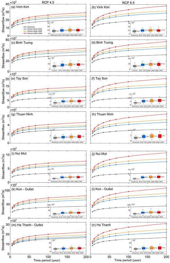 Figure 6 shows the changes in flood peak frequency under RCPs 4.5 and 8.5 scenarios across various sub-catchments that show a clear upward trend in streamflow and peak flows across all projected periods. Specifically, to accurately assess the frequency of flood flows, we conducted the analysis based on a 20-year historical streamflow (Figure 6).