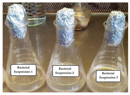 To prepare the bacterial inoculum, a loop of the isolated bacteria was transferred to 100 mL of sterile NB in a 500 mL flask and incubated at 37 °C on a rotary shaker at 200 rpm for 24 h (Figure 1). This suspension was used as the inoculum for subsequent degradation experiments, with cell numbers quantified using a haemocytometer [26].