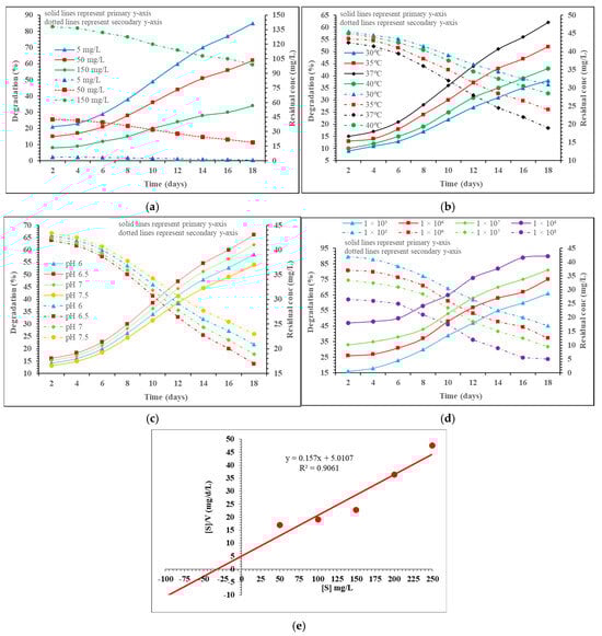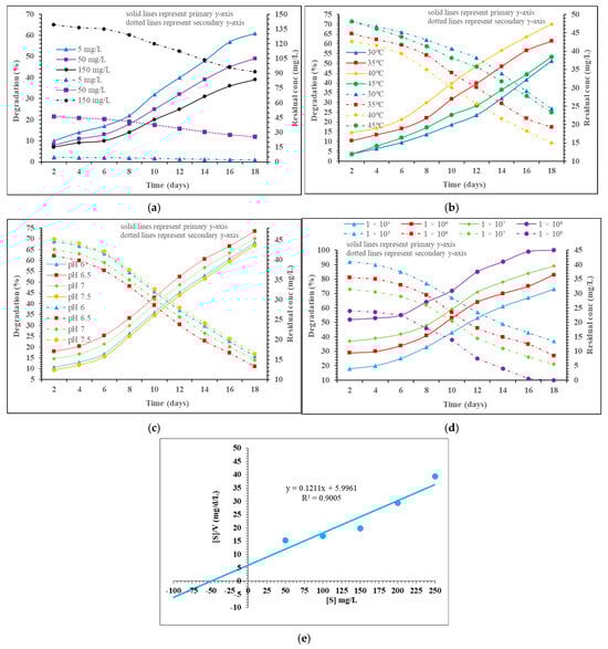 Degradation of ciprofloxacin by E. coli at different factors in lab, (a) Effect of concentration, temp: 37 °C, pH: 7, inoculum density: 105 (CFU/mL), (b) Effect of Temperature, CIP: 50 mg/L, pH: 7, inoculum density: 105 (CFU/g), (c) Effect of pH, CIP: 50 mg/L, temp: 37 °C, inoculum density: 105 (CFU/g), (d) Effect of inoculum density, CIP: 50 mg/L, temp: 37 °C, pH: 6.5, (e) Hanes plot for calculating CIP degradation kinetics in MSM.