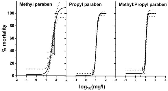 The acute toxicity of individual parabens and their (1:1) mixture was evaluated in daphnids with toxicity curves in neonates following 24 h of exposure (Figure 1), and EC values were calculated (Table 1). The EC50 values of methyl and propyl parabens were significantly different than the EC50 values of 45.31 mg/L and 11.02 mg/L, respectively, while their mixture displayed an EC50 of 11.01 mg/L. This highlights the increased toxicity of propyl paraben in comparison to methyl paraben, and show that propyl paraben is the main driver of toxicity in the mixture.