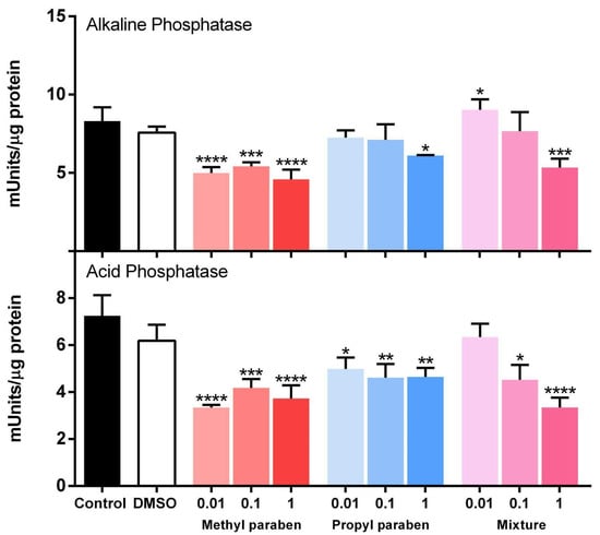 The impact of parabens on the activities of phosphatases. Data represent average ± SD (N = 3 replicates for each condition). Statistically significant differences were identified with two-way ANOVA, followed by comparison with the DMSO carrier solvent with a Dunnett’s post hoc test. Asterisks indicate statistical significance: * p < 0.05, ** p < 0.01, *** p < 0.001, and **** p < 0.0001.