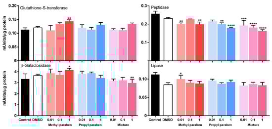 The impact of parabens on the activities of catabolic enzymes and glutathione-S-transferase. Data represent average ± SD (N = 3 replicates for each condition). Statistically significant differences were identified with two-way ANOVA, followed by comparison with the DMSO carrier solvent with a Dunnett’s post hoc test. Asterisks indicate statistical significance: * p < 0.05, ** p < 0.01, *** p < 0.001, and **** p < 0.0001.