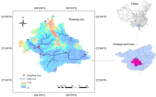 Nanning, renowned as “China’s Water City” and “China’s Green City has maintained its water quality among the top 30 cities in China in recent years. The proportion of surface water with excellent quality has reached 100%, and all monitoring sections have met or even surpassed the established water quality target requirements. To address the rising demand for domestic water consumption and flood control, numerous reservoirs have been constructed within the city, totaling 86 major reservoirs with a combined storage capacity of 16.26 × 108 m3 [18]. The construction of Dams in Nanning has led to complex water environment problems. While these structures can retain pollutants to some advantage, they also hinder the natural continuity of river flow and affect nutrient cycling in the river, ultimately resulting in environmental issues such as eutrophication and heavy metal pollution [19,20]. However, previous studies on water quality in Nanning have primarily focused on individual reservoirs or rivers [21,22], with limited comprehensive research on surface water quality assessment and the impact of heavy metals on human health in the region.