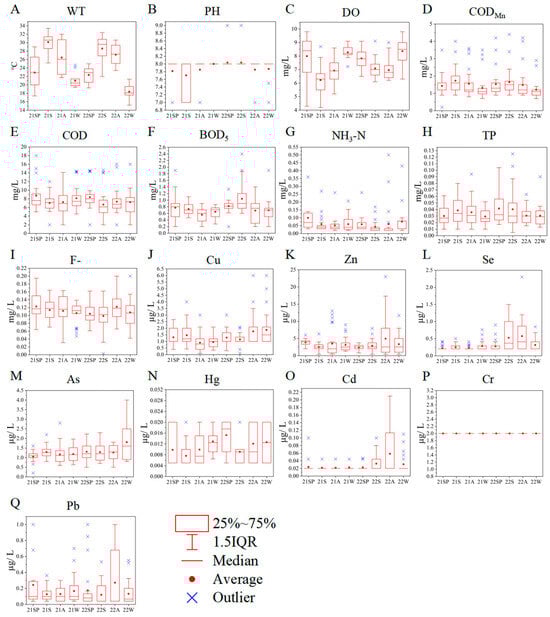 Seasonal variations of 17 water quality parameters in Nanning City, China, from 2021 to 2022, (A) WT, (B) pH, (C) DO, (D) CODMn, (E) COD, (F) BOD5, (G) NH3-N, (H) TP, (I) F-, (J) Cu, (K) Zn, (L) Se, (M) As, (N) Hg, (O) Cd, (P) Cr, (Q) Pb. (Note: the Sp, S, A, and W represent “spring”, “summer”, “autumn”, and “winter”, respectively; “21” and “22” represent the years “2021” and “2022”, respectively).