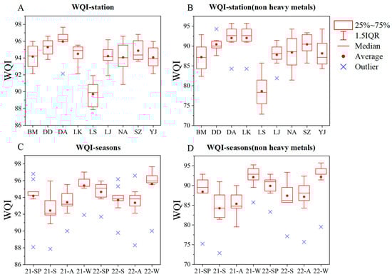 Spatial and seasonal variations of WQI in Nanning City considering the “eclipse effect” from heavy metal elements from 2021 to 2022 (note: (A) WQI-stations; (B) WQI-stations without heavy metals; (C) WQI-seasons; (D) WQI-seasons without heavy metals).