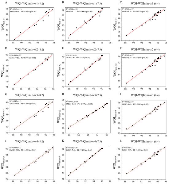 The selection of key water quality parameters was based on extensive training data, and the efficacy of each WQImin model was rigorously validated against independent test datasets, as depicted in Figure 4. The WQImin values for each model were derived from a comprehensive test results analysis. They were closely aligned with the previously calculated WQI values based on the same test data. Across all experiments involving different proportions of training and testing datasets, the WQImin–w4 model consistently demonstrated superior fitting performance. Notably, its R2 approached unity, while RMSE and PE were minimized, corroborating its robustness and reliability, which were consistent with training outcomes. However, the WQImin–w3 under an 8:2 training and testing dataset proportion and the WQImin–w2 model under a 6:4 proportion exhibited fitting statistics comparable to the WQImin–w4 within their respective ratios. Specifically, WQImin–w3 demonstrated R2 = 0.945, RMSE = 5.08, and PE = 4.58% under an 8:2 ratio, while WQImin–w2 showed R2 = 0.948, RMSE = 5.86, and PE = 3.59% under a 6:4 ratio. These results signify strong fitting and predictive capabilities. Overall, among the array of models examined, WQImin–w3 under an 8:2 training and testing dataset proportion and WQImin–w2 under a 6:4 proportion emerged as optimal models in this investigation, with identical parameter configurations. Consequently, DO, CODMn, NH3-N, Hg, WT, and Se were conclusively identified as pivotal water quality parameters for assessing water quality within the study region.