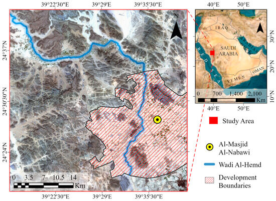 Location map of the study in Al-Madinah Al-Munawarah Province. The smaller map located in the right provides the study area’s location in Saudi Arabia.