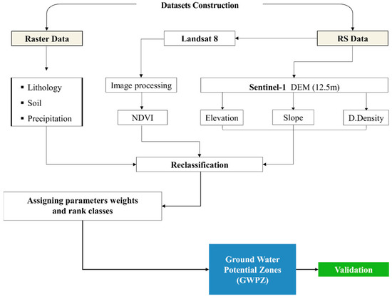 A flow chart outlining how the datasets were utilized to map the GWPZ in the study area.