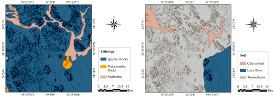 From a geological perspective, the study area has rock formations that span in age from Precambrian to Quaternary (Figure 3). The Precambrian rocks (Neoproterozoic 900 to 540 Mya) consist mostly of metavolcanic and meta-sedimentary rocks. The Cambrian and Cambrian-Ordovician formations consist of alternating layers of coarse-to-fine-grained sandstones and micro gabbro rocks. Furthermore, there are lava flows from the Tertiary to Quaternary period, as well as deposits from the Quaternary period consisting of sand, gravel, silt, and sabkha units [33,34,35,36,37]. The Wadi Al-Hamd Basin can be divided into three distinct topographical zones [27]. Firstly, there is the Najd Plateau, situated in the eastern part of the basin and ranging in elevation from 750 to 1600 m above mean sea level. Secondly, there is the Hijaz mountain, which spans from sea level in the main channel of the Wadi to over 2000 m on the western side. Lastly, the northern and southern parts of the basin are characterized by the presence of lava flows from Harrat Hirmah and Harrat Rahat. Calciorthids and Torriorthents are the predominant soil types in the study area, particularly within Wadi Al-Hamd (Figure 3). Calciorthids create a layer of soil and have a texture that is sandy to loamy. Torriorthents primarily develop on slopes that are undergoing active erosion. The composition of Torriorthents includes loamy sand, fine sandy loam, sandy loam, loam, or clay loam, as well as their gravelly equivalents [38,39,40,41,42].