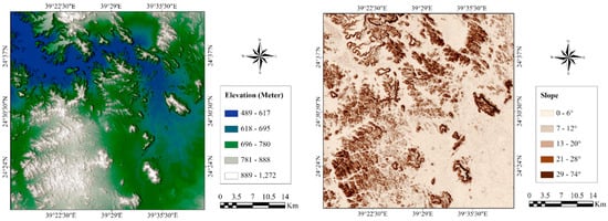 (left) A map depicting the digital portrayal of the surface elevation of the study area, showing a range from 489 to 1272 m above mean sea level (AMSL). (right) A map illustrating the various slopes found in the study areas. The gradient in the lower class ranges from 0 to 6, while in the higher class it spans from 29 to 74.