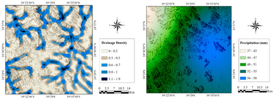 (left) The map displays the five classifications of drainage density in the study region, with values ranging from 0 to 0.20 (km/km2) for the lowest classification and from 1.10 to 1.90 (km/km2) for the highest classification. (right) A map illustrating the precise distribution of precipitation levels within the studied area. The highest recorded measurement was 58 mm, while the lowest recorded measurement was 37 mm.