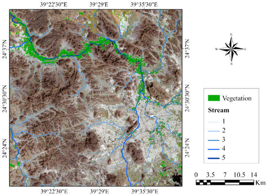 The study area encompasses five stream orders, ranging from first order in the high highlands to the fifth one in wadi Al-Hamd. The highest recorded NDVI value was reported in the east–west expansion of Wadi Al-Hamd.