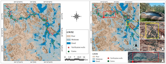 The catchment in the study area is categorized into three classifications according to its groundwater potential: very poor/poor, moderate, and good. The regions with extremely poor or poor potential encompass 805.81 km2 of the research area, accounting for 44.91% of the total. The places are situated in the upstream segment of the watershed, particularly inside the hilly sections of the basement. The moderately groundwater-potential zones, covering an area of 819.31 km2 (45.67%), are situated in low-lying areas at the base of mountainous regions. These zones are characterized by moderate slopes, permeability, and productivity. Conversely, the areas with good potential for groundwater cover a total of 169.06 km2 (9.42%) and are located in Wadi Al-Hamd and its accompanying date farms, which consist of sandy loam and sandy clay loams. Good GWPZs are identified by their low drainage density, low terrain, and low slope.