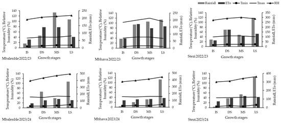 Weather data [rainfall, relative humidity (RH), reference evapotranspiration (ETo), and air temperature] distribution according to growth stages [initial stage (IS), development stage (DS), mid-season stage (MS), and late-season stage (LS)] of the two growing seasons (2022/23 and 2023/24), for Mbalenhle, Mbhava, and Stezi.