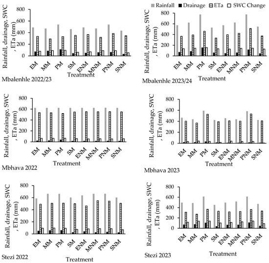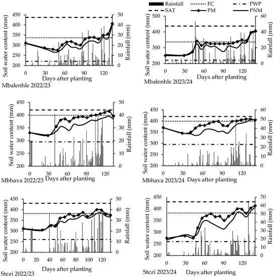 The integration of cultivar × mulch × locality had an insignificant (p > 0.05) effect on rainfall and changes in soil water content (SWC); meanwhile, secondary integration cultivar × locality significantly affected (p < 0.05) these two variables (Figure 5), and the results showed consistency over the growing seasons. All the treatments showed similar trends for SWC throughout the season, however, only treatments with the Panamera cultivar are shown in Figure 6. This cultivar was the last one to reach maturity and represent an entire season of SWC. Panamera with mulch (PM) was found to have higher changes in SWC across localities, with an average ranging from 44 to 126 mm, whereas Sababa (not mulched) (SNM) recorded the lowest changes in SWC, with a two-season average ranging from 31 to 97 mm. It was observed that mulch improved soil water storage, and, as a result, the mulched plots had higher SWC compared to the plots without a mulch treatment. Furthermore, high late-season rainfall resulted in higher water storage in the soil, causing high differences in SWC between planting and harvest. Drainage was minimal during the growing season for all localities; the uneven rain distribution and dry spells led to reduced drainage (Figure 5). For instance, when rain comes, it always finds the soil dry, except where there is mulch treatment. Therefore, rainwater must supply soil needs, then the surplus percolates downwards, which was mainly observed under mulch and towards the end of the season because soil moisture was near field capacity storage in these cases (Figure 6). In general, the late-maturing cultivar (Panamera) had higher drainage due to the high water available, and the crop was not using a lot of water at this stage (Figure 5). The other cultivars (Mondial, Electra, and Sababa) matured earlier than Panamera, as shown in Table 1; therefore, they experienced less drainage and the SWC was above field capacity storage once or twice in the season. In Mbalenhle, changes in SWC under mulch treatments were 7.9 to 21.6% higher compared to those without mulch treatments. Meanwhile, those in Mbhava and Stezi were higher by 15.7 to 20.0% and 5.8 to 24.7%, respectively. However, the positive effects of mulch, such as improved utilization and conservation of rainfall, were insignificant due to erratic rainfall and its distribution in soil water. Previous studies [,] also found higher soil water storage in treatments with mulch compared to those without mulch treatments. Therefore, it can be seen that mulch enhances soil moisture availability through the collection of ineffective rainfall, reducing soil evaporation and improving rainfall infiltration during heavy rains []. Soil water content differs across localities; this further shows that the localities had different soil properties (Table 3) and climates (Figure 2), leading to different SWCs. All localities received substantial rainfall for both seasons, and soil texture contributed to the observed differences. Mbhava and Stezi are in the same agroecological zone, however, where there were differences in SWC, this is attributed to non-climatic factors such as the high clay content in Mbhava (Table 3), which led to high water-holding capacity, whereas, in Stezi, the sandy soils resulted in higher drainage. Therefore, smallholder farmers can explore the practices of mulch application to improve soil moisture content in localities that have high drainage soils, considering rainfall variability under such settings. Hence, the practice will be valuable.