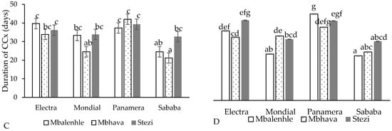 Maximum canopy cover (CCx) of selected cultivars across localities [(A) 2022/23 and (B) 2023/24] and duration of CCx [(C) 2022/23 and (D) 2023/24]. Error bars is the standard deviation, bars with the same letter differ non-significantly (p > 0.05).