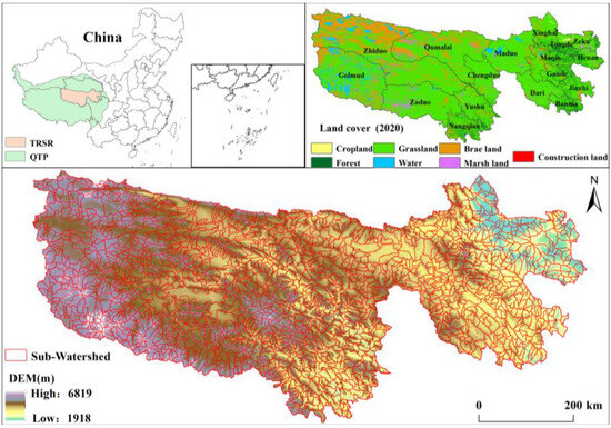 The TRSB is located in the northeast region of the Qinghai-Tibet Plateau (31.39°~36.12° N, 89.45°E ~102.23°E), covering an area of approximately 370,000 km2. It is the birthplace of the Yangtze River, Yellow River, and Lancang River (Figure 1). The region is characterized by a diverse array of land types, predominantly grasslands, which account for about 70% of the area, along with an extensive distribution of snow-capped mountains, glaciers, rivers, lakes, and wetlands. The topography is complex, primarily consisting of mountains and plateaus, with an average altitude of approximately 4500 m, gradually rising from southeast to northwest, making it one of the world’s most biodiverse high-altitude natural conservation areas [35]. The climate is characterized as a typical plateau continental climate, with distinct cold and warm season alternations, small annual temperature ranges, large diurnal temperature variations, and intense solar radiation. The average annual temperature varies between −5.4 °C to 4.1 °C, with an annual precipitation of about 470 mm, identifying it as an area sensitive to global climate change [36]. The TRSB is endowed with a unique alpine ecosystem, where its biodiversity and water conservation, among other ESs, play a crucial role in China’s ecological security and sustainable development. However, the ecosystem of this region is sensitive and fragile, posing significant challenges for conservation and restoration. Since the 21st century, the Chinese government has implemented ecological restoration projects such as “Major ecological protection and restoration projects in the TRSB” [37]. Although these initiatives have achieved certain successes, the task of ecological protection in the TRSB remains formidable.