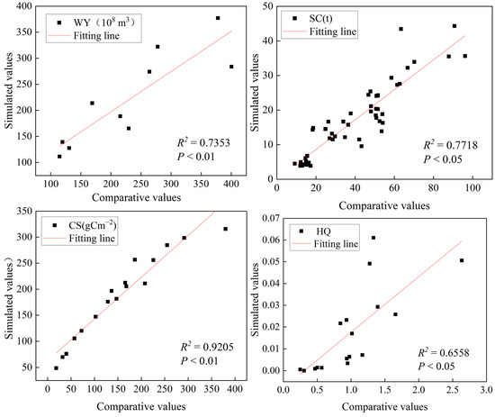 We substantiated the precision of the ES evaluation within this research by leveraging existing statistical information and publicly available scholarly datasets. For WY, validation was conducted utilizing the Hydrological Bulletin’s statistical data from the Water Resources Department of Qinghai Province (http://slt.qinghai.gov.cn/, accessed on 15 July); the SC assessment results were verified against a soil conservation atlas of ecological changes on the Qinghai-Tibet Plateau from similar studies; the net primary productivity (NPP) results simulated by the CASA model in this study were validated using a remote sensing-derived NPP dataset; and the HQ assessment results were verified by comparing the level of habitat degradation in the HQ simulation process data of this study with the dataset of human activity intensity on the Qinghai-Tibet Plateau. Collectively, these validations confirmed that the ES evaluation in this study was accurate (Figure 2).