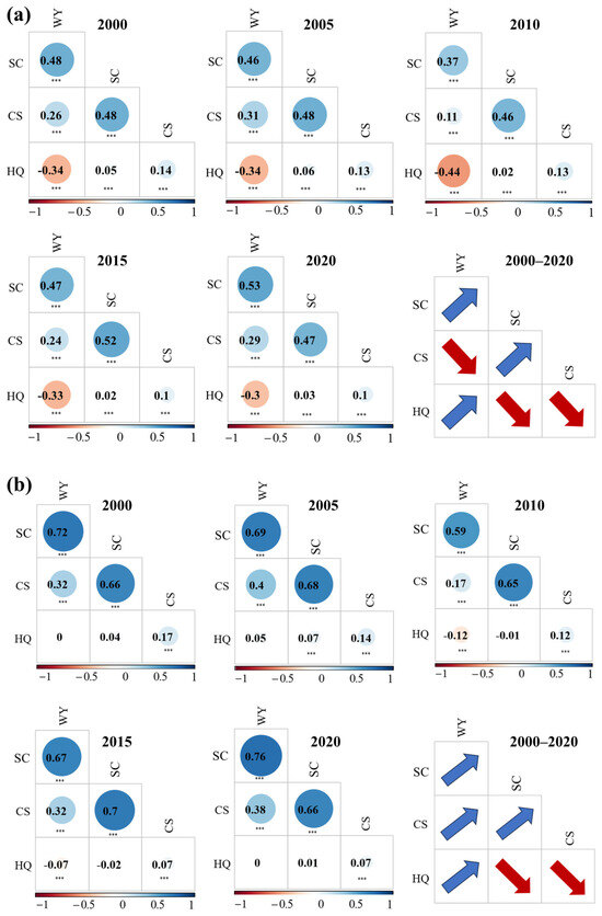 At the sub-watershed scale, the correlation coefficients for all ES pairs surpassed those at the grid scale, with the WY–HQ pair showing a particularly notable increase in correlation, which mitigated their trade-offs to the point of non-significance. The synergies among other ES pairs were even more evident. Over the period from 2000 to 2020, the correlation coefficients for SC–HQ and CS–HQ at the sub-watershed scale decreased, whereas those for other ES pairs increased. It was evident that the trade-offs and synergistic relationships among ESs exhibited a clear scale effect; as the scale increased, the synergistic actions among ESs were enhanced, and trade-offs declined.