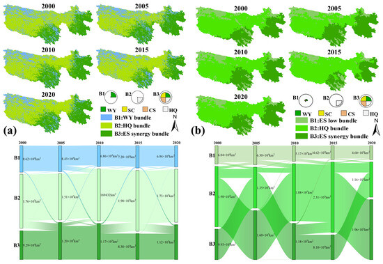 We identified distinct ES bundles at both scales within the TRSB and examined the inter-bundle transitions over the period from 2000 to 2020 (Figure 6). The grid-scale classification yielded three ES bundles: the WY bundle (B1), characterized by elevated WY and diminished levels of other ESs, mainly in the northwestern and southern TRSB; the HQ bundle (B2), noted for its high HQ and reduced levels of other ESs, primarily in the central TRSB; and the ES synergy bundle (B3), where all ESs were markedly high and spatially synergistic, predominantly in the eastern and southern TRSB. The transition matrix analysis revealed that from 2000 to 2020, the area of B1 decreased, primarily transitioning toward B2; concurrently, B2 transitioned toward B3, with an increase in the areas of B2 and B3. At the sub-watershed scale, the ES bundles mirrored the grid scale’s spatial distribution, albeit with B1 being classified as the ES low bundle due to its uniformly low ES levels, and its coverage was considerably smaller than that of the grid scale. B2 and B3 maintained their characteristics and spatial distributions as observed at the grid scale. Over the two decades, there was a notable shift from B1 to B2 and an intensified transition from B2 to B3, resulting in a decrease in the areas of B1 and B2 and a marked enlargement of B3, indicative of the sustained ecological amelioration in the TRSB.