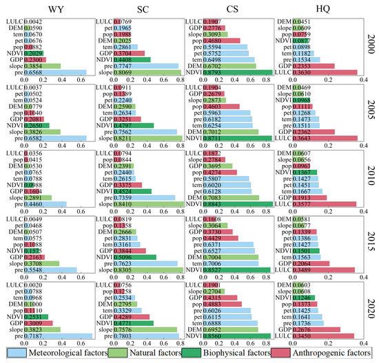The explanatory power of the driving factors for ESs at the grid scale evolved. Note: pre = precipitation; tem = temperature; pet = potential evaporation; pop = population; GDP = gross domestic product; DEM = digital elevation model; NDVI = normalized difference vegetation index; LULC = land use and land cover. The abbreviations in Figure 8 and Figure 9 are the same as these.