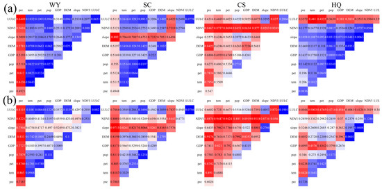 Interactions for driving factors of ESs in 2020. (a) Grid scale. (b) Sub-watershed scale.