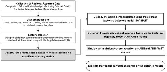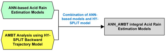 In the previous section, this study modularized three models, namely (1) ANN-based acid rain estimation models, (2) AMBT analysis using the HY-SPLIT backward trajectory model, and (3) ANN_AMBT integral acid rain estimation models. The relationships among these three models are illustrated in Figure 3. The specific roles of each module in the framework are described below.