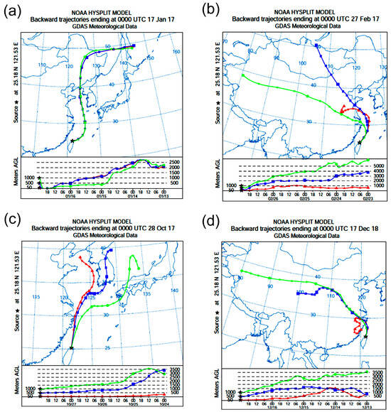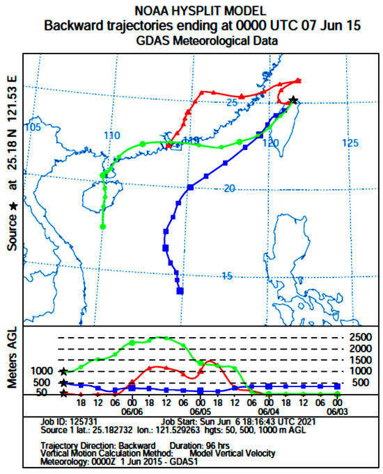 According to Chen and Chen [3], AMBTs were conducted at 100 m, 500 m, and 1000 m above ground level to represent airflow trajectories at surface, middle, and high altitudes, respectively. In this study, the AMBT model was simulated at three different altitudes above ground level: 50 m (red line), 500 m (blue line), and 1000 m (green line), representing low-, mid-, and high-elevation airflows, respectively (see Figure 4). In the figure, the star symbol indicates the research location, with each node covering a six-hour interval. The regional long-range pollution information obtained at each altitude was then classified into the three regions outlined in Figure 1: Region C, Region R, and Region S.