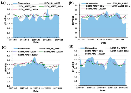 Table 7 shows the prediction error results for severe acid rain event dates in the corresponding months, while Figure 6 illustrates the observed values and predicted trends for these months. The results indicate that during the winter season, when severe acid rain is most prevalent, all LSTM models—LSTM_No_AMBT, LSTM_AMBT_50m, LSTM_AMBT_500m, and LSTM_AMBT_1000m—are capable of appropriately simulating the pH values of acid rain. Specifically, the LSTM models integrated with trajectory information outperform the LSTM_No_AMBT model in describing the variation profile of rainwater pH. Additionally, the root mean squared error (RMSE) comparison shows that the LSTM models achieve the smallest errors, with LSTM_AMBT_500m providing the most accurate predictions.