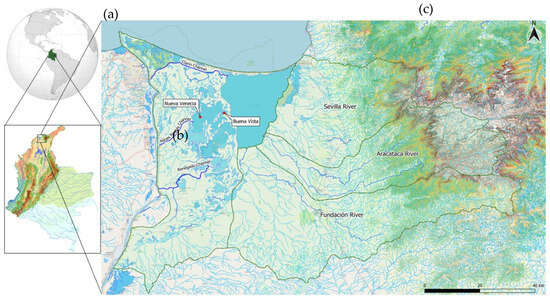 Location of the study area. (a) Colombia’s location (green) on the global map. (b) The Ciénaga Grande de Santa Marta in northern Colombia. (c) Location of Nueva Venecia and Buenavista where the evaluated water production systems are located.