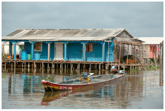 In the local context of this study, the lack of potable water has been a constant issue in the area. The stilt house villages, amphibious settlements located within the Ciénaga Grande Santa Marta (CGSM) swamp complex, have traditionally been supplied with water from the Aracataca River and, more recently, from the Magdalena River through the Aguas Negras Canal. These waters are characterized by high and diverse levels of organic and inorganic contamination [3,4]. In addition, these villages lack adequate infrastructure to ensure a safe water supply for the population. As a result, a large percentage of the medical consultations in these districts’ population is related to gastrointestinal diseases, acute respiratory infections, skin diseases, and eye infections in children (Sitionuevo Mayor’s Office, personal communication).