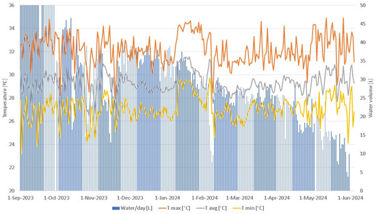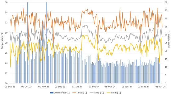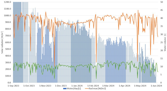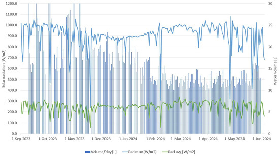 For the set of 12 distillers installed in Nueva Venecia, the average daily volume obtained was 33.5 day−1, i.e., an average yield of 2.8 L day−1 m−2. As seen in the figures, atypical values were reported in September, which were above 50 L day−1. This was due to an undistilled water leak, which was repaired in October 2023. The statistics showed a direct relationship between the volume of water produced, temperature (Figure 8), and solar irradiance (Figure 9) in this locality.