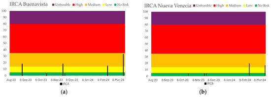 IRCA (black bars) for the water treatment plants in (a) Buenavista and (b) Nueva Venecia. Colors indicate the level of risk.