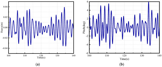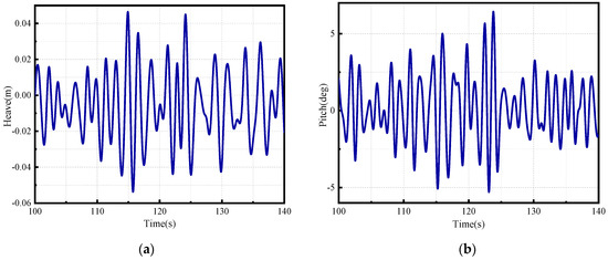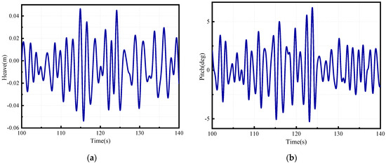 After conducting numerical simulation for the aforementioned conditions, the motion time histories are depicted in Figure 6 and Figure 7. The numerical simulation lasts for 500 s with a time step of 0.01 s, yielding 50,000 time steps for both heave and pitch data. Only a portion of the time histories is displayed in the figures.