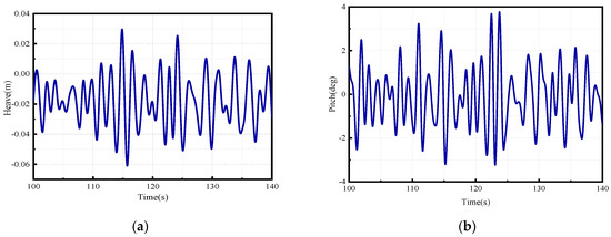 After conducting numerical simulation for the aforementioned conditions, the motion time histories are depicted in Figure 10 and Figure 11. Because of the numerical simulation spanning 500 s, only partial time histories are displayed.