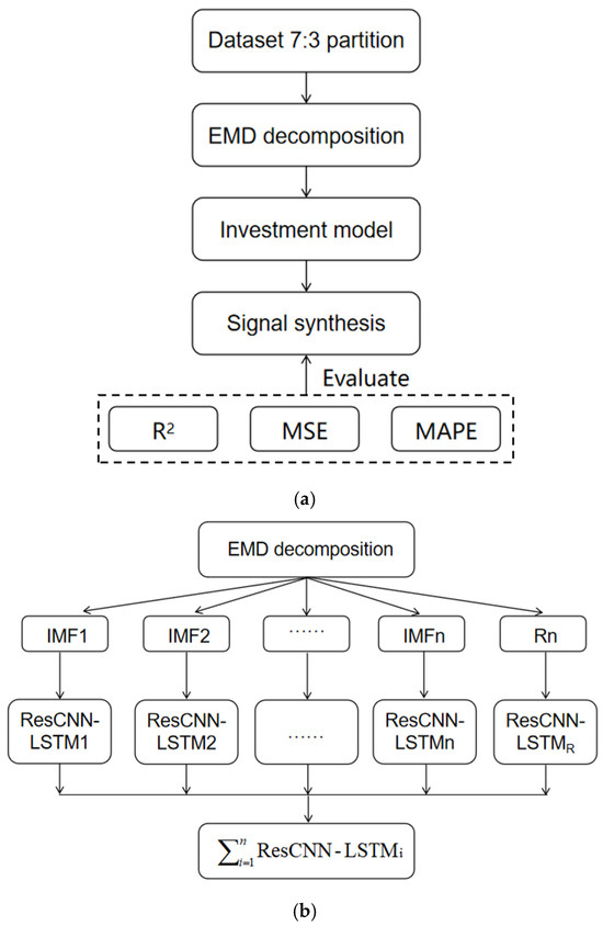 Prediction process and model structure. (a) Prediction process; (b) EMD-ResCNN-LSTM model flow chart.