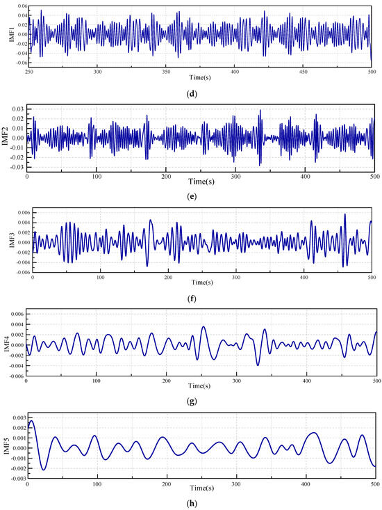 After validating the EMD algorithm’s effectiveness through verification, it was applied to decompose and process the data. Detailed decomposition analysis was conducted on the heave and pitch data recorded under different operational conditions. Due to the substantial volume of post-decomposition data, Figure 17 presents only the decomposition results of the heave motion data under operational condition one.