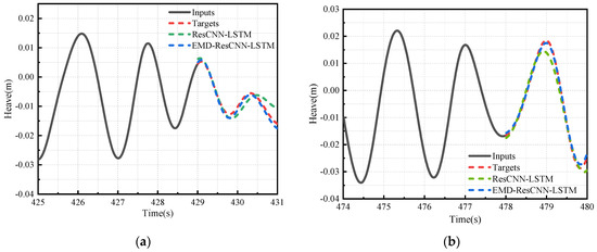 The IMF components and residuals obtained from the EMD decomposition of heave and pitch motion data under operational conditions one and two were used to establish ResCNN-LSTM models. The data were split into training and testing sets in a 7:3 ratio. A multi-step prediction approach was implemented, using four seconds of motion data as the input to predict the subsequent two seconds. Consequently, the input layer comprises 400 nodes, while the output layer contains 200 nodes. The mean squared error of the multidimensional output served as the loss function, with Adam as the optimization algorithm. Training continued for 100 epochs with an initial learning rate of 0.001. To facilitate comparison, the predictive outcomes of the EMD-ResCNN-LSTM model under two operational conditions are compared with the ResCNN-LSTM model. Due to the large sample size, two individual samples from each operational condition’s heave and pitch test sets were randomly selected for demonstration, as illustrated in Figure 18, Figure 19, Figure 20 and Figure 21.
