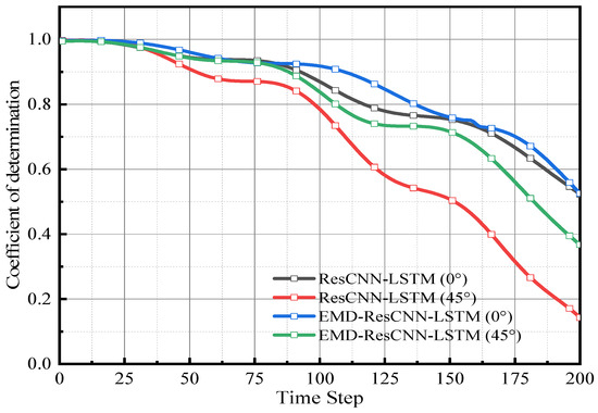 Figure 22 shows that the EMD-ResCNN-LSTM model’s R2 values exceed those of the ResCNN-LSTM model for all predicted time steps, regardless of wave incident angle (0 or 45°). The EMD-ResCNN-LSTM model demonstrates superior predictive performance, effectively addressing the shortcomings of the ResCNN-LSTM model and reducing discrepancies in predicting heave motion of offshore platforms under different wave incident angles. The results illustrate a significant decrease in the variability of R2 values for heave motion predictions across different wave incident angles after undergoing processing with the EMD-ResCNN-LSTM model. Notably, there is a substantial improvement in the forecast accuracy of heave motion, with R2 values consistently exceeding 0.7 throughout the prediction time steps, particularly evident at a 45° wave incident angle.