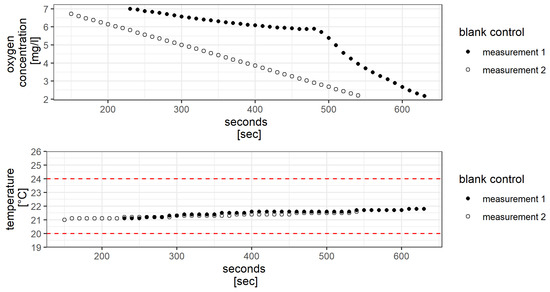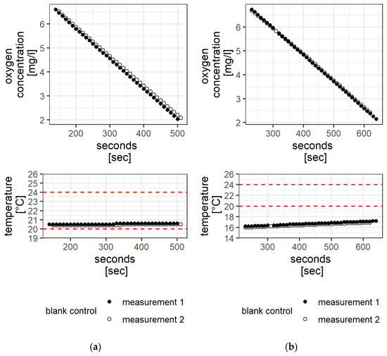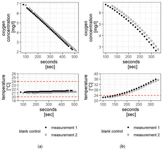 The objective of this experiment was to investigate the influence of the measurement temperature. Experiment 2 was performed as described in Section 2.4.2, and the results are shown in Figure 1. Under Figure 1a, a blank control (duplicate determinations) with an almost constant temperature profile within the valid range (20–24 °C), a high linearity (R2 = 0.999) was observed. Measurement 1 resulted in an oxygen consumption of 41.62 mg/Lh, and measurement 2 yielded 42.12 mg/Lh. In Figure 1b, the hotplate of the magnetic stirrer was heated. The linearity of the blank control (duplicate determinations) decreased (R2 = 0.989) and the oxygen consumption increased (measurement 1: 68.76 mg/Lh; measurement 2: 66.27 mg/Lh).