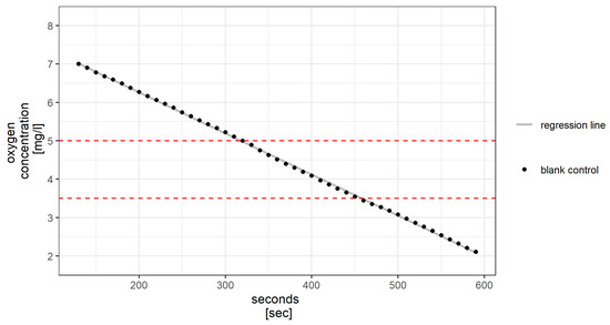 Experiment 5 was performed as described in Section 2.4.3, and the results are shown in Figure 3 (duplicate determination of a blank control). Measurement 2 (200 rpm) resulted in an oxygen consumption of 41.72 mg/Lh. In measurement 1 (90 rpm), it can be observed that complete mixing occurred too late and, therefore, the linearity was only established at an oxygen concentration of approximately 5 mg/L, making the measurement unusable.